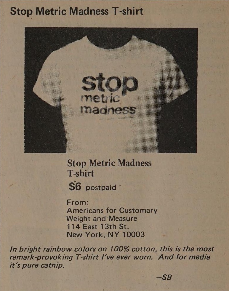 In 1975, as the United States made its latest (and last) half-hearted attempt at converting to the metric system, Stewart Brand launched his anti-metric campaign. The first salvo fired in this one-sided war was the “Metric System Con,” written by Steve Baer with an introduction by Brand, published in the Winter 1974 issue of the CoEvolution Quarterly. Baer, designer of the Drop City Domes, took a both-sides approach to the question of metrication. He listed its singular advantage, that it was divisible by 10, and its numerous cons: its smugness, its foreignness, and its bureaucratic meddling that spread its stamp of rationality where it had no business being. Besides, he continued, imperial’s base 12, which is easily halved and halved again, is far superior to lengthy decimal equivalents; conversion is easy; and a foot is a foot—why have a painted piece of wood to repeat what’s already at the end of your leg?1