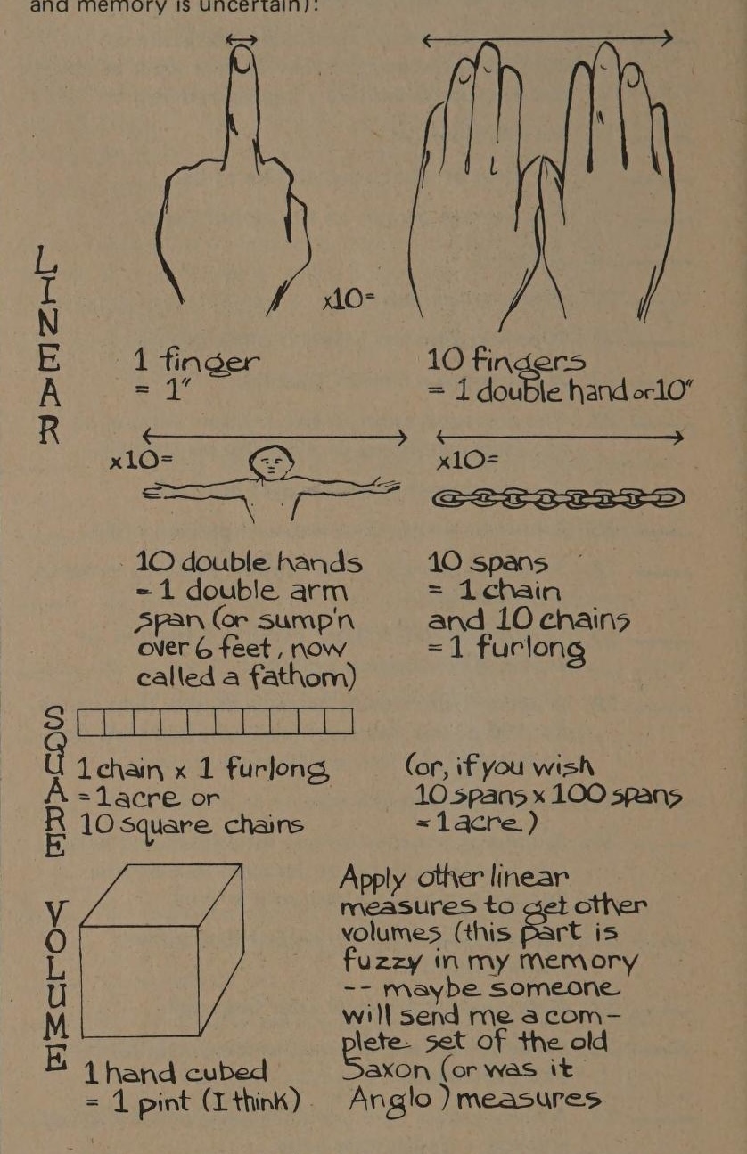 The combination of ancient and new technologies, as outlined in Fred Turner’s seminal work From Counterculture to Cyberculture, was essential for this expansive Whole Earth project. The imperial system, as defended in the pages of the Catalog, should be understood as an ancient technology or a form of indigenous knowledge—not indigenous to the land or its original inhabitants, but to the colonial-settler-cowboy-pioneer the back-to-the-land movement venerated and emulated. “The Metric System Con” by Baer was included in the Soft Technology section of CQ, and later included in the 1978 publication Soft-Tech, in recognition of its tool-ness.33 In the article “Soft Tech Defined,” Brand listed thirty-five characteristics that defined Soft Technology, including: ecologically sound, craft industry, village emphasis, decentralist, integration with nature, democratic politics, local bartering, compatible with local culture, operating goals understandable by all, and technical goals valid—a self-conscious echo of the French metrication rallying cry “for all men for all time.”34