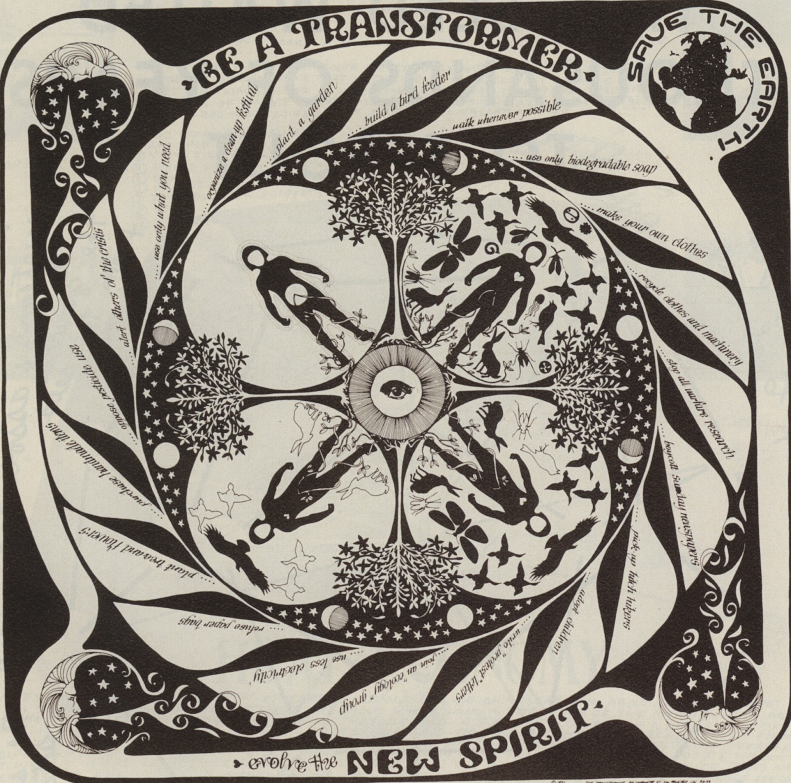 After moving his design studio from San Francisco’s North Beach to a remodeled car repair shop nestled between Tomales Bay and the Point Reyes National Seashore, Ashby published a final pitch for the Transformer project in the Winter 1975 issue of the CoEvolution Quarterly. “Finding Our Place In Space” (subtitled “a handy step by step guide for getting from where we are to where we ought to be”) consists of eight drawings, each inscribed within the circular frame of a mandala. The opening image invokes the star-spattered pattern of a distant nebula. Upon closer inspection, what appears to be a cloud of stars resolves into a swarm of stick figures, human and animal, interspersed with totemic symbols. By combining the view from a telescope with the iconography of ancient rock pictographs, Ashby compresses space and time in a single image. Succeeding pages depict seven stages of human transformation that conjoin the spiritual with the earthly; unlike the “Way of Sorrows” depicted in the fourteen Stations of the Cross, Ashby’s devotional sequence telegraphs not the pain but rather the joy of bodily resurrection. Step One, captioned “clear your head / clean up your dreams / get easy and believe in the new possibilities,” depicts a winged angel hovering with arms outstretched, his transparent body networked with veins and nerves. He makes landfall in the next panel, which counsels: “move about / look down / pick a place / come down gently and tune yourself to the natural vibrations.” Steps Three and Four show him shedding wings that suddenly have become superfluous. Roots sprouting from his feet dive into the ground: “look and listen / move slow / tread softly / stay open and be part of what the place is being,” Ashby instructs, “grow slowly / flow steady / try hard / don’t worry / remember that everything is connected.” In panels Five and Six, his terrestrial anchorage sprouts an umbilical bough. It pushes upward and blooms; birds gather about a crowning blossom. Ashby’s captions become commandments: “live lightly on the land / share / recycle / do less with less / dream small / feel big / care / teach children / think healthy / this is the glue that holds things together.” A closing image returns to a familiar mandala centered on the planet. Four fallen angels, each holding aloft a flowering umbilical shoot, mark the diagram’s cardinal points. Ashby bestows a parting benediction: “maintain yourself / steward the earth / love and we will all have a place in space.” Consecrating the development of an earthbound soul reattuned to sacred whole systems precepts, Ashby argues for biophilic custodianship as an ecstatic alternative to the seductions of consumer citizenship.